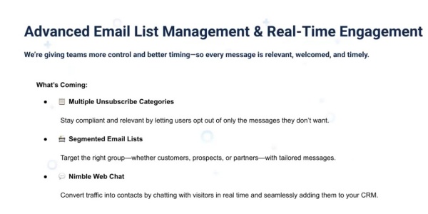It will be interesting to see what Nimble will do with segmented email lists. Of course, right now you can segment your lists via tags or search but, apparently, this is going to be something different. Unsubscribe options will be a plus allowing folks choices between unsubscribing to all messaging or just to certain types of messages.
